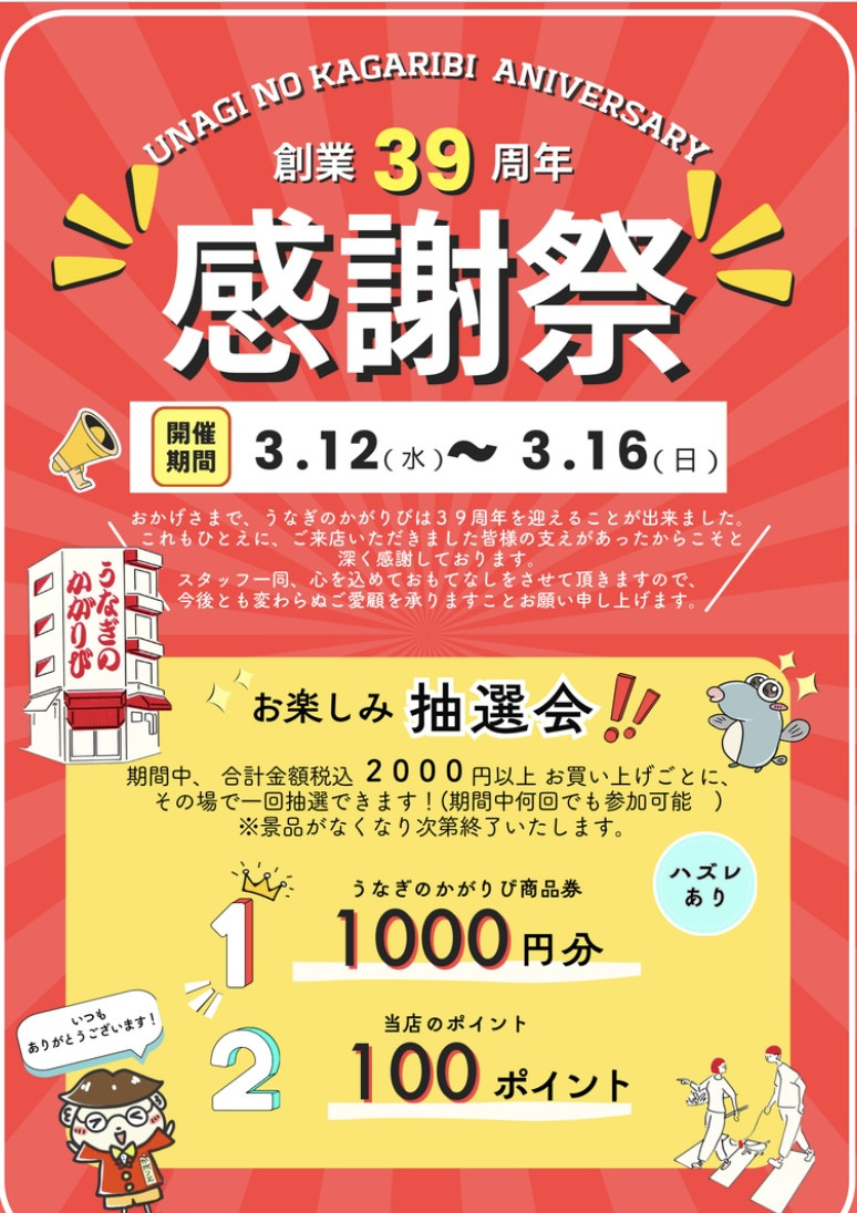 おかげさまで、うなぎの篝火は39周年を迎えることができました。これもひとえに、皆様の温かいご支援のおかげです。心より感謝申し上げます❗️スタッフ一同、心を込めておもてなしをさせていただきますので、今後とも変わらぬご愛顧をお願い申し上げます🤲
