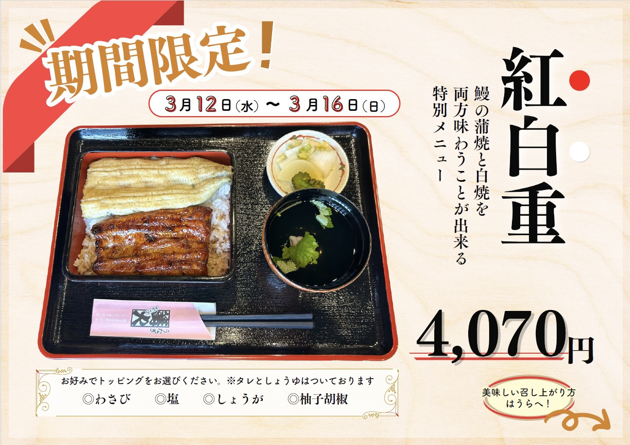 紅白弁当はオリジナルラッピング付きです。蒲焼きの薬味アレンジや白焼きの美味しさをぜひお楽しみください😁